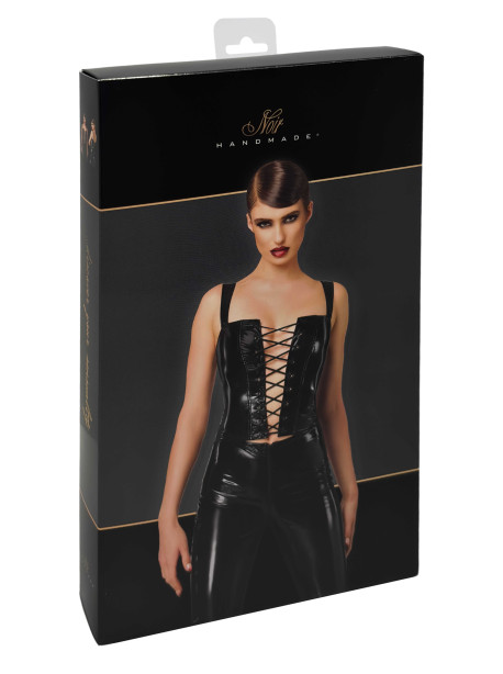 F379 Dominae Corset Top en PVC Lacé sur l’Avant – Noir Handmade | Top Corset Élégant et Sensuel